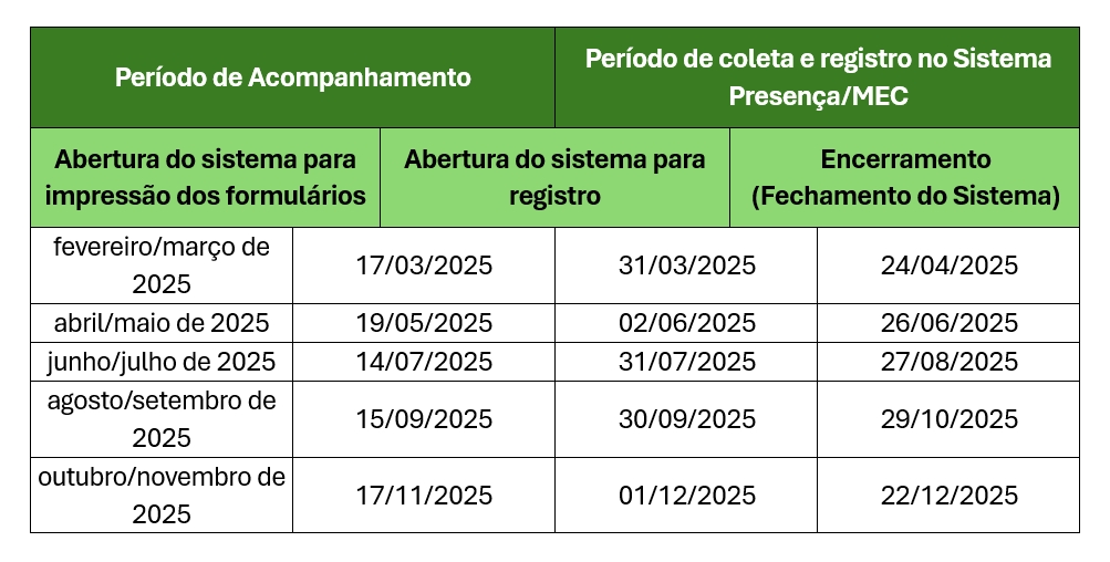 QUADRO II: Calendário do Acompanhamento das Condicionalidades de Educação – Exercício 2025