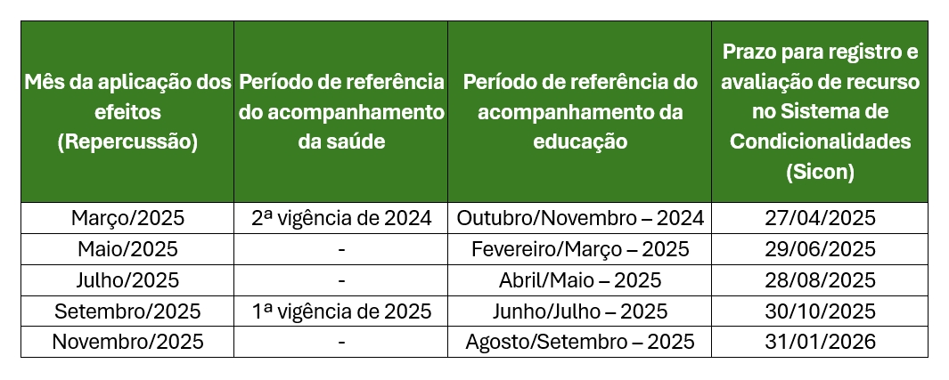 Estabelece os calendários do exercício de 2025 para o acompanhamento das condicionalidades de saúde e educação, aplicação de efeitos, os recursos administrativos e a interrupção temporária dos efeitos de não cumprimento do Programa Bolsa Família.