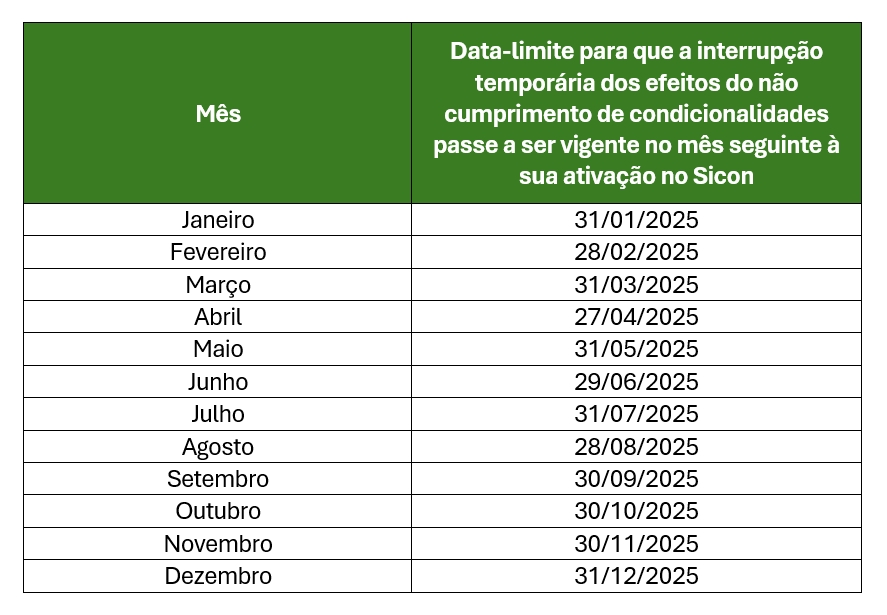 QUADRO IV: Data-limite para que a interrupção temporária dos efeitos do não cumprimento de condicionalidades passe a ser vigente no mês seguinte à sua ativação no Sicon