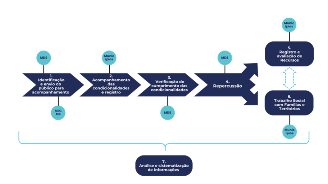 A relação do público beneficiário para acompanhamento das condicionalidades é gerada pelo Ministério do Desenvolvimento e Assistência Social, Família e Combate à Fome e encaminhada ao Ministério da Educação e ao Ministério da Saúde.